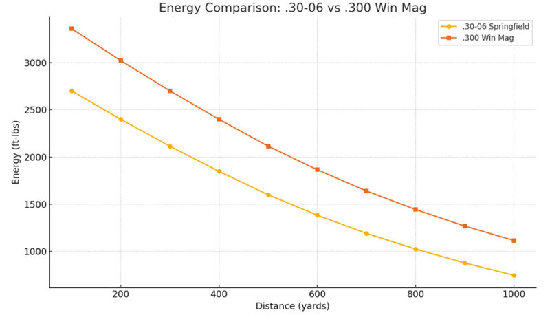 Both cartridges lose energy with distance, but the .30-06 drops below 1,500 ft-lbs. (a typical ethical hunting threshold for large game) at around 500 yards, while the .300 Win. Mag. maintains it out to approximately 800 yards.