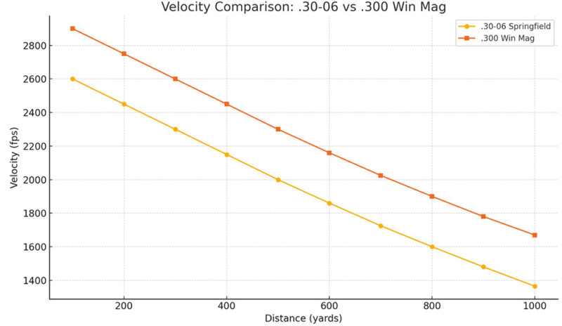 The velocity of both cartridges decreases over distance, but the .300 Win. Mag. shows less velocity loss, especially beyond 400 yards.