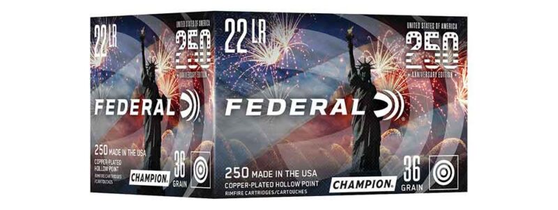 Federal’s Champion Rimfire load offers precision for target shooting and small game hunting. Its 36-grain design provides accuracy and consistent expansion, making it popular among both beginners and seasoned shooters. Each collectible box highlights the 250th anniversary’s theme—honoring the spirit of independence and innovation that defines America’s shooting heritage.