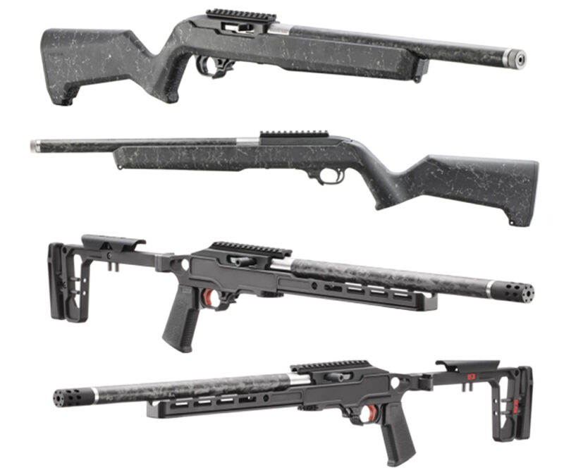 Ruger’s Custom Shop is also introducing two new 10/22 rifles fitted into a chassis manufactured by Grey Birch and featuring a tensioned barrel with a carbon fiber sleeve and BX-Trigger. They have identical features with one for right-handed shooters and one for left-handed shooters. The high-end Grey Birch chassis is adjustable for length of pull and comb height and folds for easy transport. The 10-inch forend features M-LOK slots and has an Arca-Swiss rail under the forend.