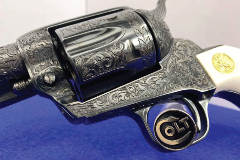 Ivory grips with Colt medallions complete the aesthetic, and the revolver’s deep blue finish provides stunning contrast to the hand engraving. It is a centerpiece-level SAA suited for display under glass and represents one of the strongest engraved offerings in the entire event.