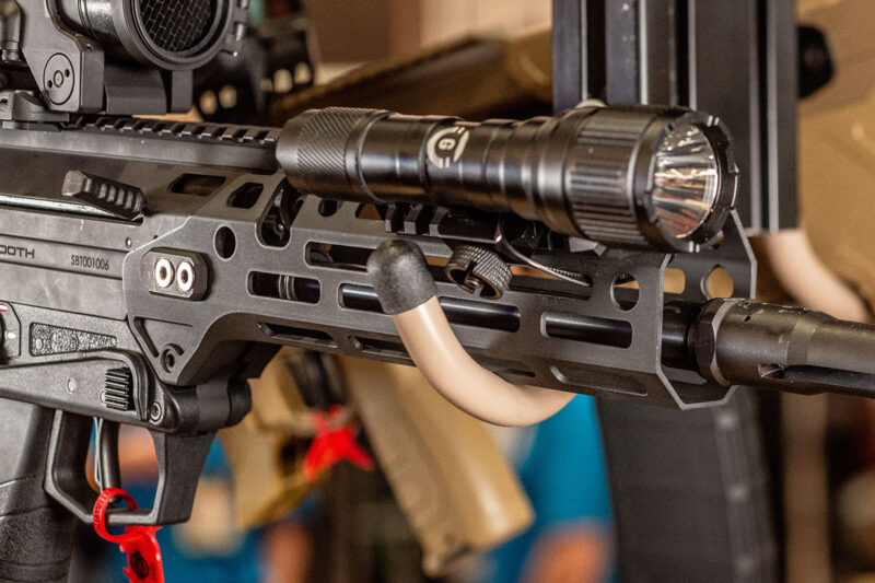 One of the complaints that Desert Tech received with the WLVRN handguard is that it’s polymer, so it doesn’t really maintain 0 if you’re mounting sites on the front of the handguard. With the new Sabertooth we added this clamping mechanism that clamps to the receiver to ensure a very rigid connection to that receiver and make sure that it stays straight and maintains the zero.