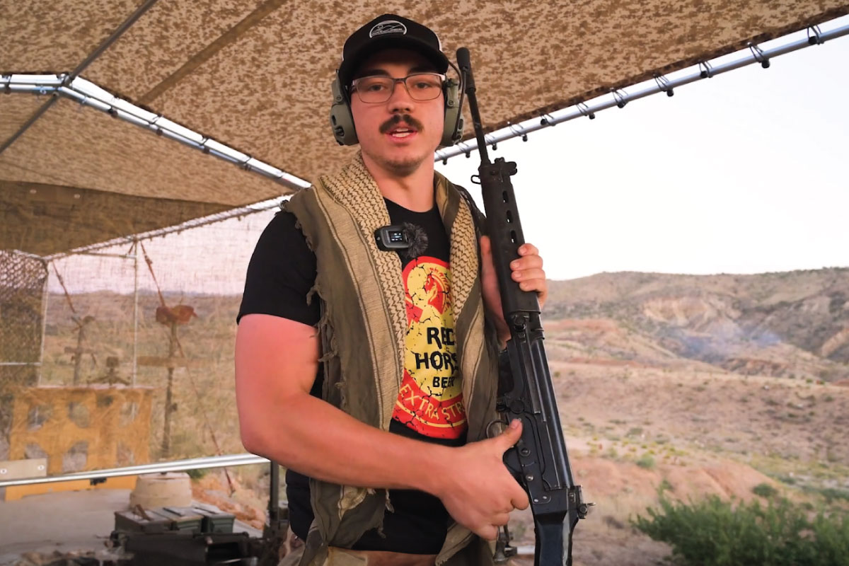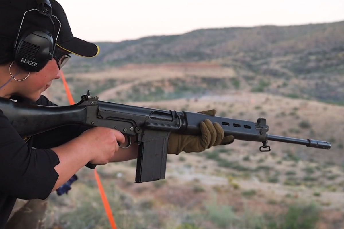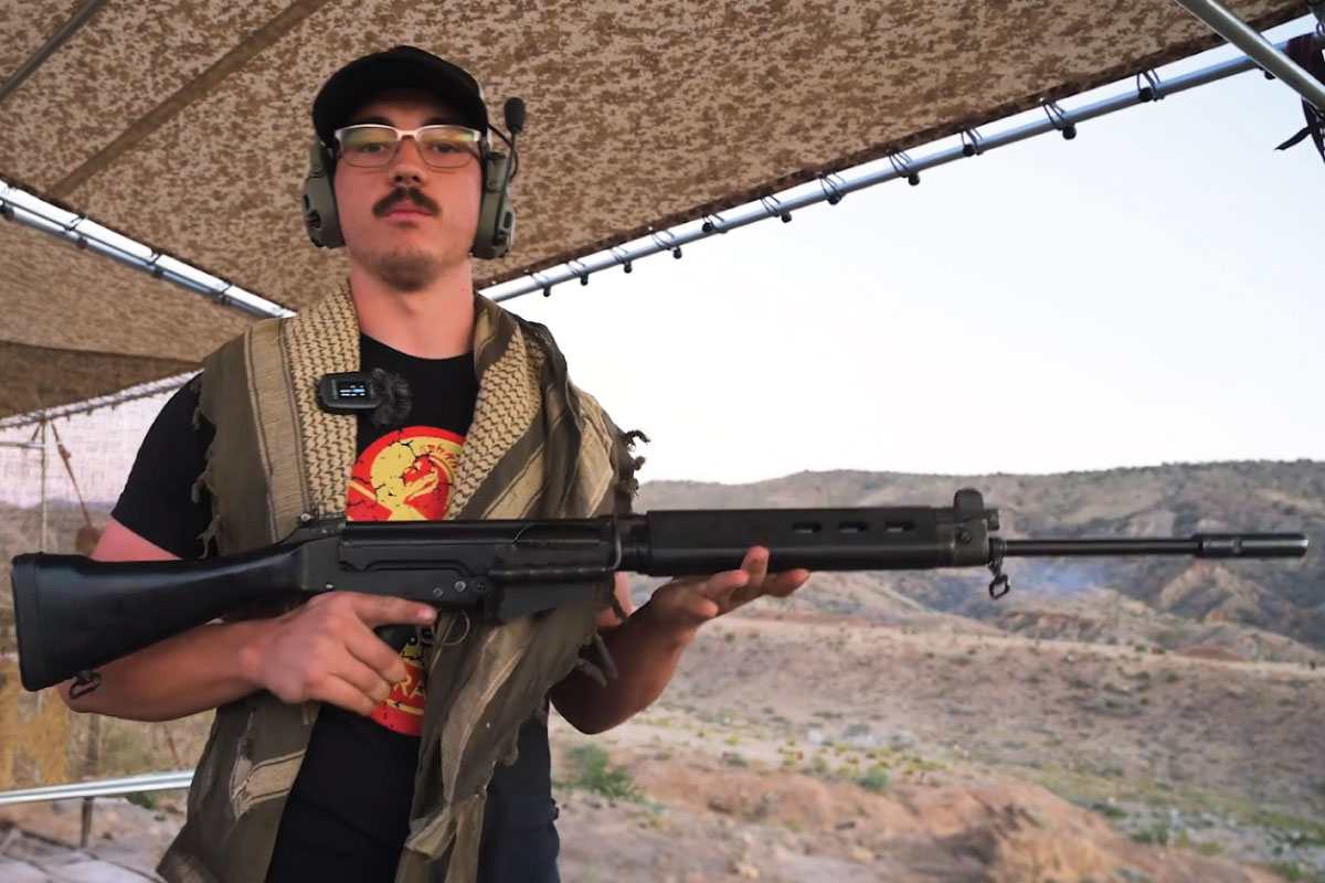 Dominic sharing the FN FAL, manufactured by Fabrique Nationale, at the Big Sandy Machine Gun Shoot in Arizona. This firearm that has been used all around the world and has been known to be called the “right arm of the free world.” Every country, except for the United States, adopted it at some point. It’s a great battle rifle. The FAL is chambered in 308 and functions as a semi automatic and as a full automatic.